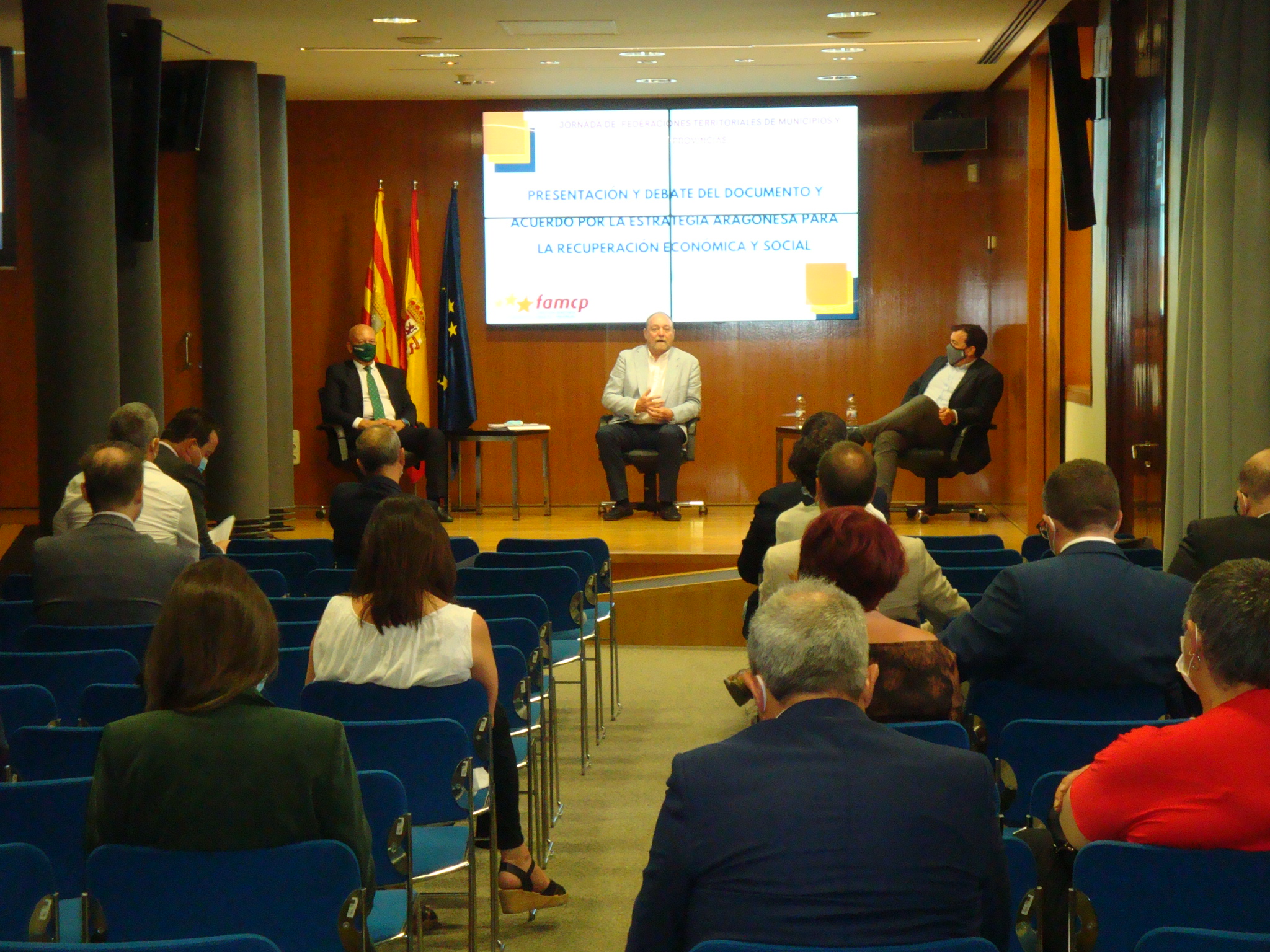 La Federación Aragonesa de Municipios, Comarcas y Provincias (FAMCP) ha invitado a las federaciones territoriales de municipios del resto del Estado a conocer de primera mano la Estrategia Aragonesa para la Recuperación Económica y Social, acuerdo alcanzado entre el Gobierno de Aragón, los partidos políticos con representación parlamentaria (excepto Vox), los agentes sociales y la propia Federación aragonesa de municipios. El encuentro se ha celebrado en la sala Goya del Palacio de la Aljafería y ha contado con la presencia del presidente del Gobierno de Aragón, del de las Cortes, así como de representantes de los grupos parlamentarios aragoneses.