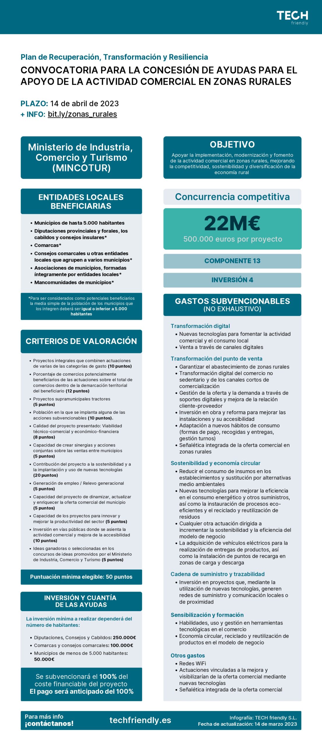 Ayudas para el apoyo de la actividad comercial en zonas rurales. El objetivo de esta convocatoria es apoyar la implementación, modernización y fomento de la actividad comercial en zonas rurales, mejorando la competitividad, sostenibilidad y diversificación de la economía rural.