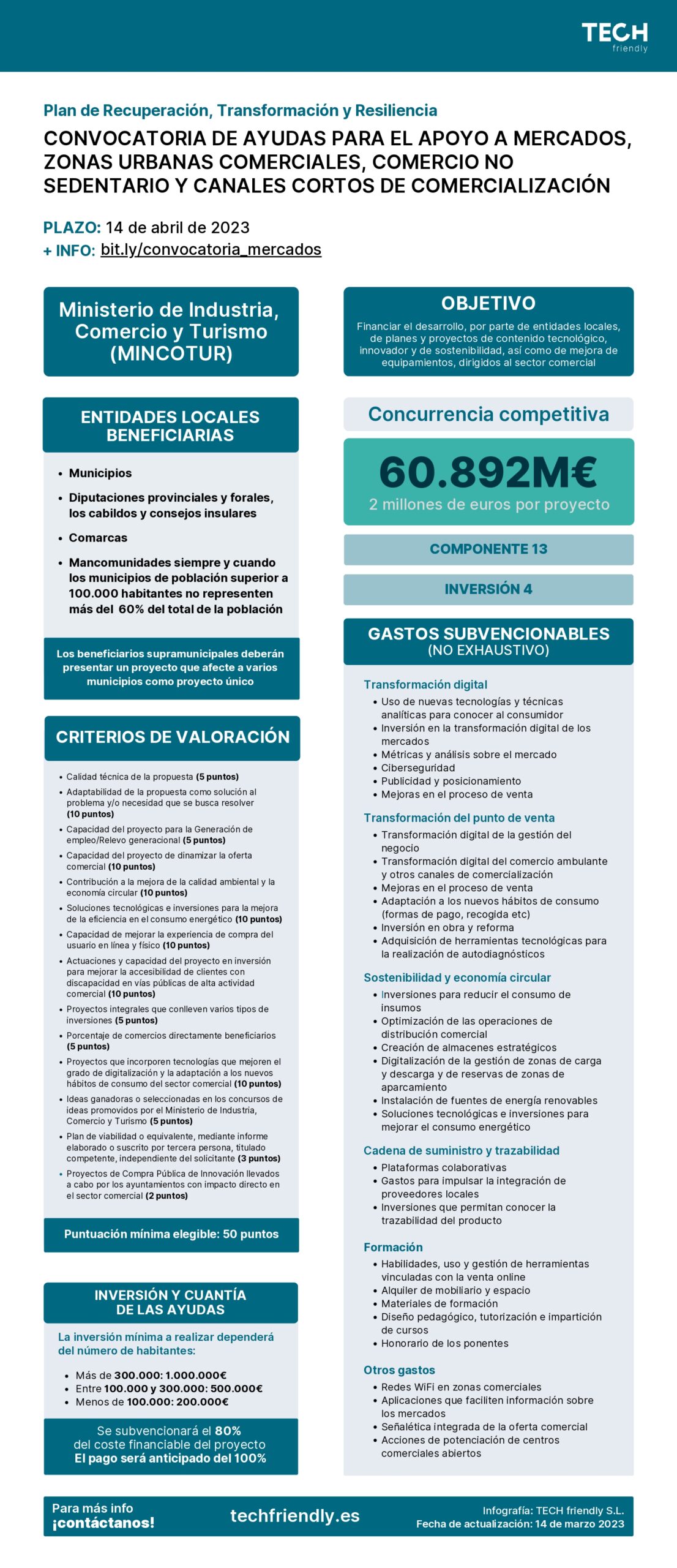 - Ayudas para el apoyo a mercados, zonas urbanas comerciales, comercio no sedentario y canales cortos de comercialización. El objetivo de esta convocatoria es financiar el desarrollo, por parte de entidades locales, de planes y proyectos de contenido tecnológico, innovador y de sostenibilidad, así como de mejora de equipamientos, dirigidos al sector comercial.