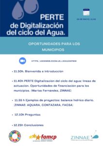 Con el fin de acceder a la oportunidades que los fondos de Recuperación brindan a las Entidades Locales, te invito a participar en el webinario informativo sobre el PERTE de Digitalización del ciclo del agua y las oportunidades que se abren para los municipios, el próximo 24 de mayo de 11.30 a 12:30, via zoom