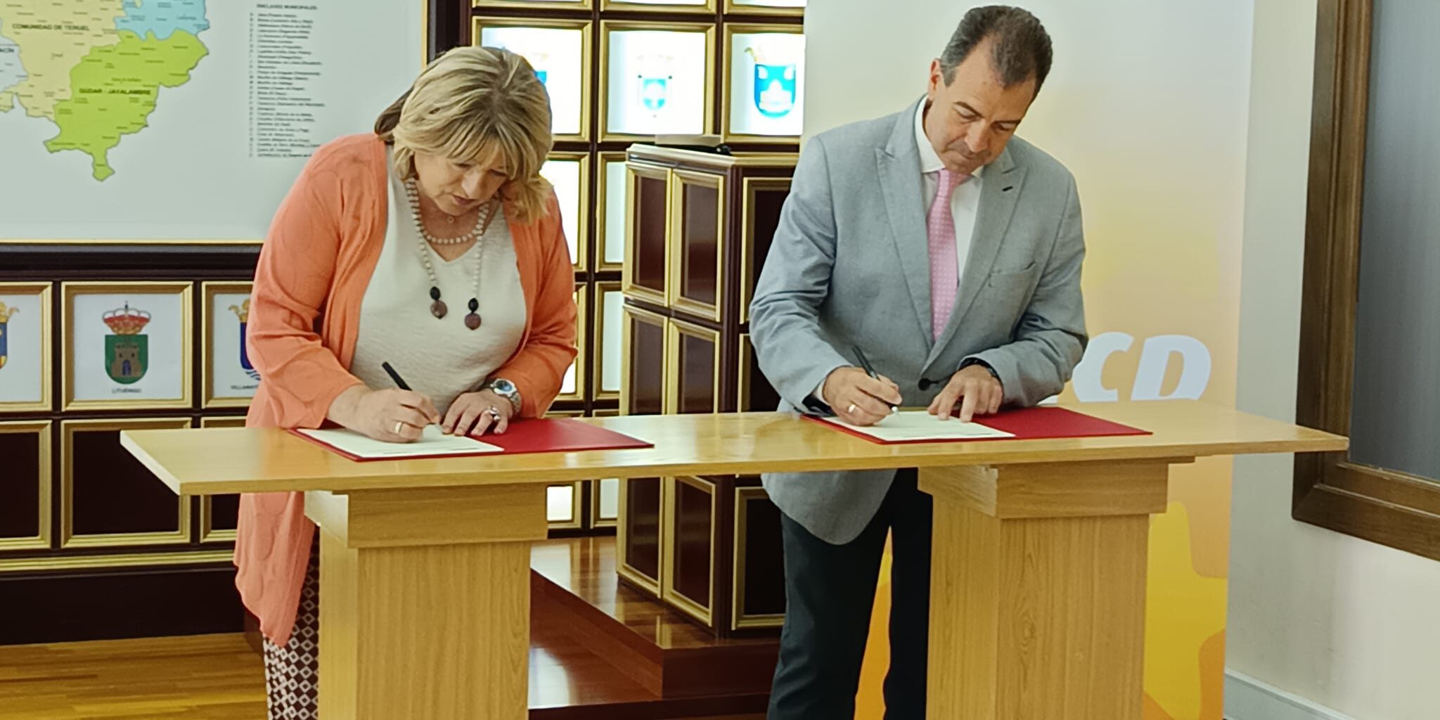 La consejera de Presidencia, Interior y Cultura, Tomasa Hernández, y Carmelo Pérez, presidente de la FAMCP han firmado el convenio de colaboración destinado a realizar actividades de fomento, capacitación y divulgación para facilitar, a las entidades locales, la participación en los Fondos Next Generation y el mecanismo de Recuperación y Resiliencia para el año 2024.