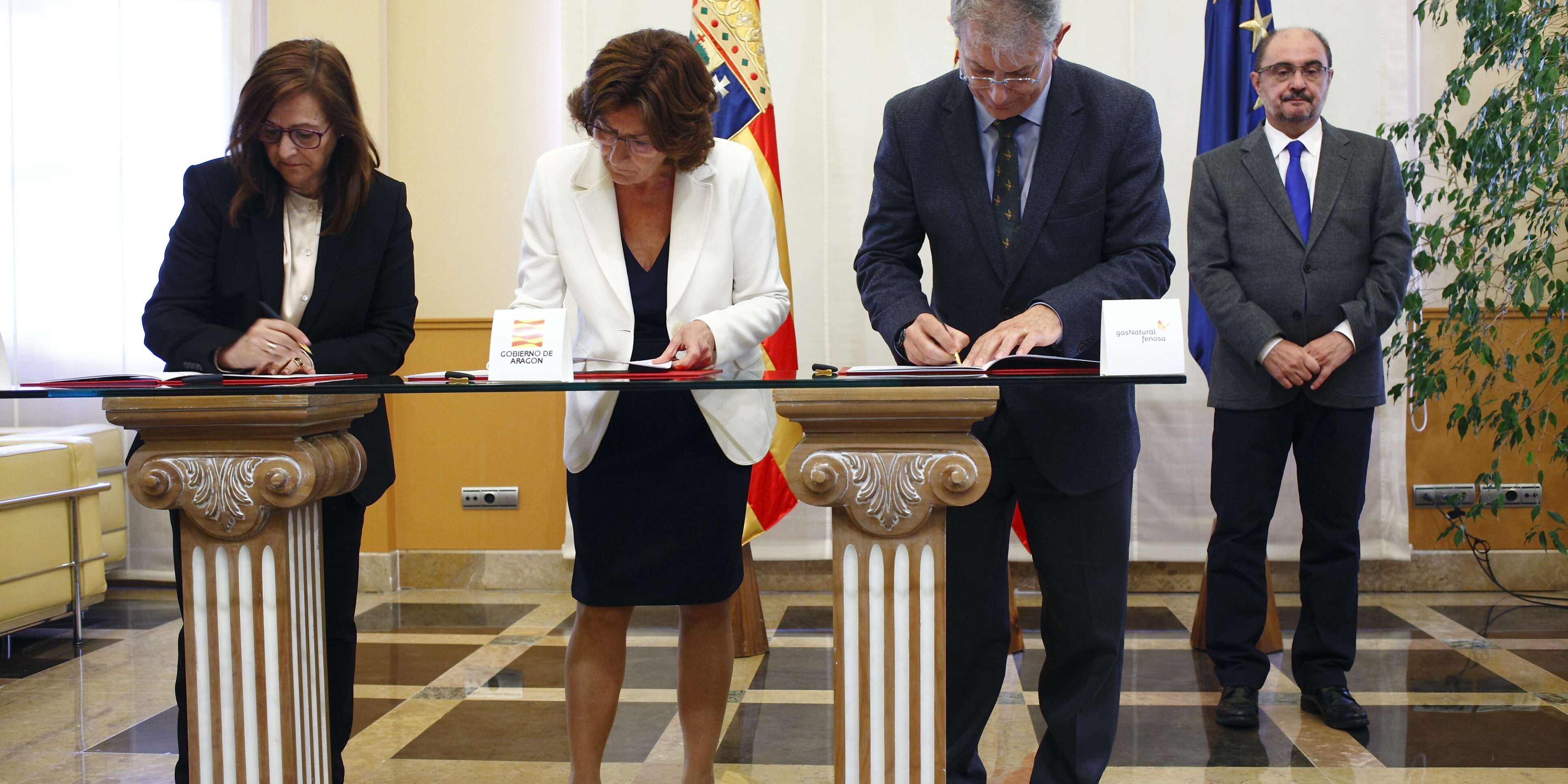 El presidente del Gobierno de Aragón, Javier Lambán, la consejera de Ciudadanía y Derechos Sociales del Gobierno de Aragón, María Victoria Broto, el director de Zona Este de Ventas y Operaciones de Gas Natural Fenosa, Antonio Franquesa, y la presidenta de la Federación Aragonesa de Municipios, Comarcas y Provincias (FAMCP), Carmen Sánchez, han firmado hoy un acuerdo para luchar contra la vulnerabilidad energética y garantizar la protección de aquellas personas y familias en situación de vulnerabilidad o urgencia social en Aragón.