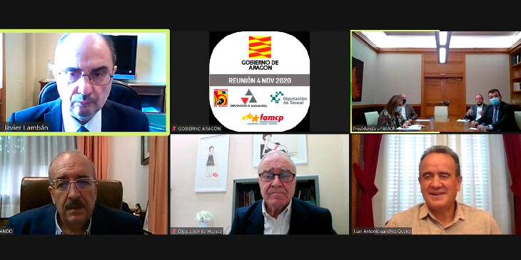 El presidente de Aragón, Javier Lambán, junto con la consejera de Presidencia, Mayte Pérez, mantuvo este miércoles una reunión telemática con el presidente de la FAMCP, Luis Zubieta, y los presidentes de las diputaciones provinciales de Zaragoza, Huesca y Teruel, Juan Antonio Sánchez Quero, Miguel Gracia y Manuel Rando, respectivamente.