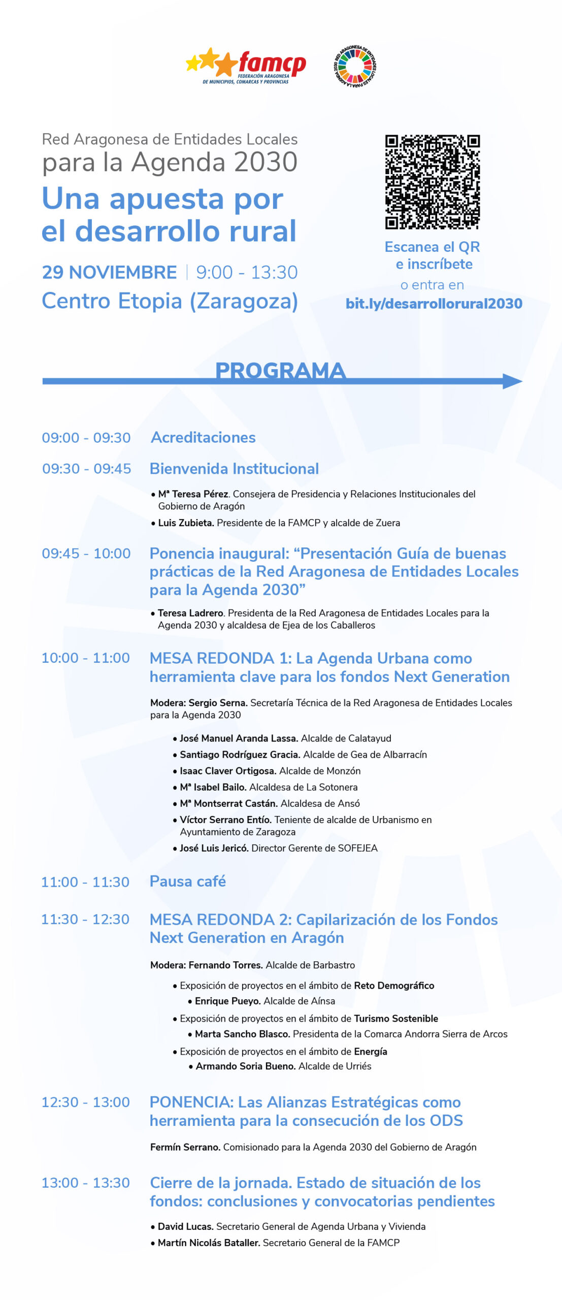 Tengo el placer de invitarte al Encuentro «Una apuesta por el desarrollo rural», que organizamos desde la Federación Aragonesa de Municipios Y Provincias (FAMCP) en relación a la Red Aragonesa por la Agenda 2030. El encuentro tendrá lugar en Zaragoza el próximo 29 de noviembre a partir de las 9:00 en el Auditorio del Centro ETOPIA.