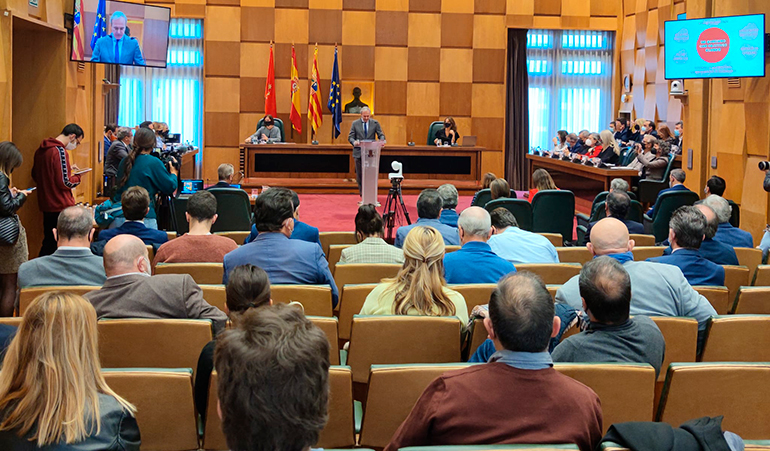 La jornada ha empezado con la intervención del alcalde de Zaragoza, Jorge Azcón, que ha sido seguida con atención por el presidente de la FAMCP, Luis Zubieta, y por el secretario general, Martín Nicolás.