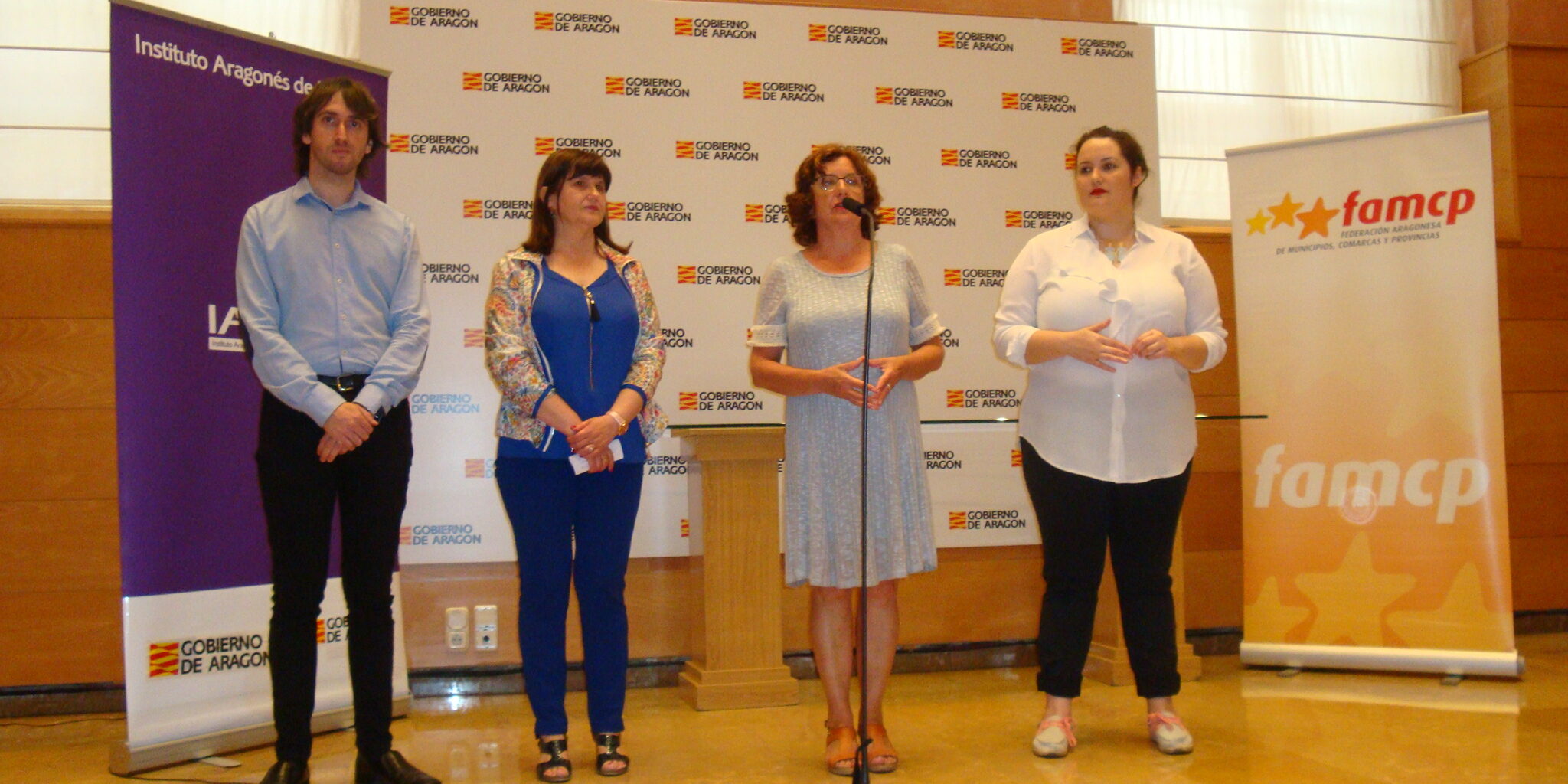 La consejera de Ciudadanía y Derechos Sociales, María Victoria Broto; Julia Vicente, miembro de la Ejecutiva de la FAMCP; la directora del IAM, Natalia Salvo; y el director del IAJ, Adrián Gimeno, han presentado hoy esta iniciativa que toma como referencia la campaña del año pasado y la Red Aragonesa de Entidades Locales Libres de Agresiones Sexuales (RAELLAS) que se creó como consecuencia de esa acción.