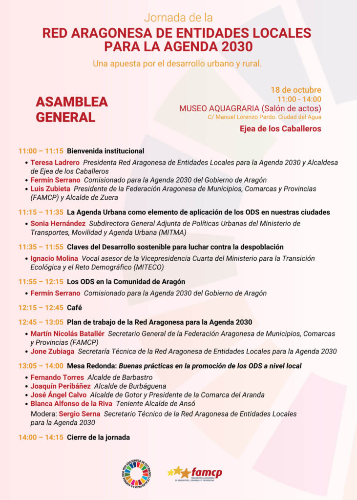 La bienvenida institucional será a cargo de Teresa Ladrero, presidenta de la Red y alcaldesa de Ejea; Fermín Serrano, comisionado para la Agenda 2030 del Ejecutivo aragonés, y Luis Zubieta, presidente de la FAMCP y alcalde de Zuera.