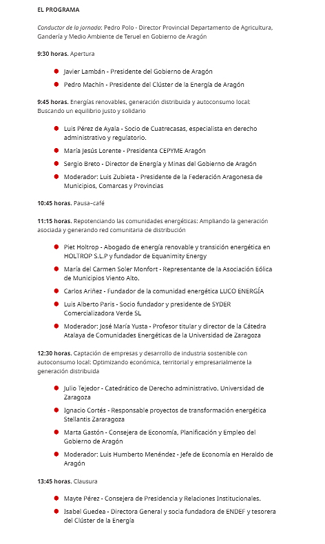 La jornada, que abrirá el presidente del Gobierno de Aragón, Javier Lambán, estará protagonizada por conceptos claves como el autoconsumo, la industria sostenible o las redes comunitarias y aspira a favorecer el debate y el contraste de opiniones.